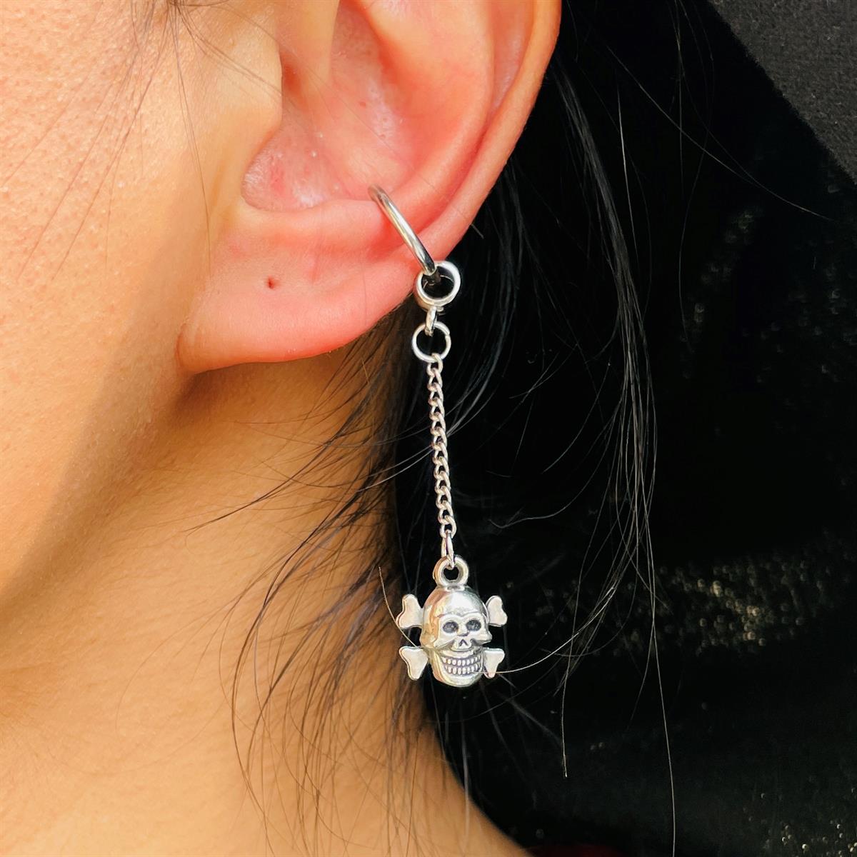 Embrace the edgy style with this chain and skull, stainless steel unisex earring. Its gothic-inspired design adds an edgy touch to any outfit. - Stainless steel construction - Adjustable, no-piercing required